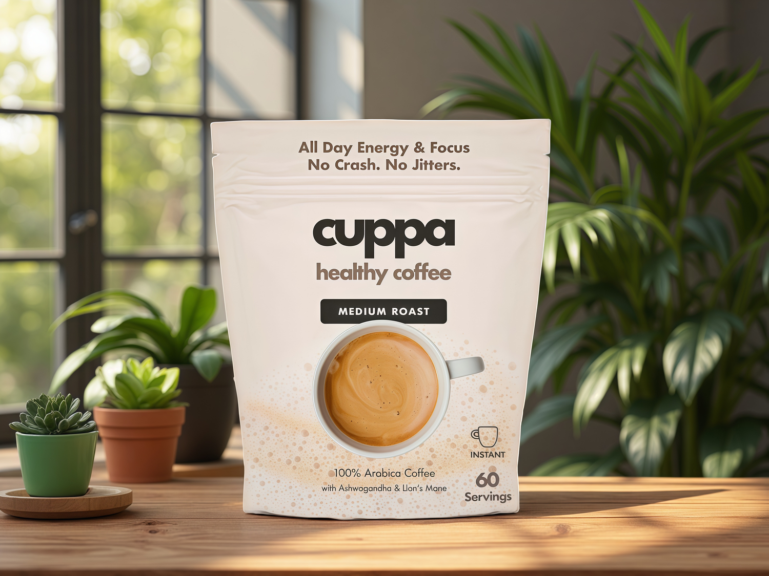 Each cuppa contains about 70mg of caffeine, which is up to 50% less than your regular cup of coffeewhich typically ranges from 100-140mg depending on roasting (ours is medium) and serving size.However, unlike your regular cup of coffee, cuppa adds L-Theanine, Ashwagandha and MCT to harnessthe power of caffeine to work for you, not against you. No jitters or crash, just stable, sustained energyall day. Oh and better sleep and mood too. You're welcome.